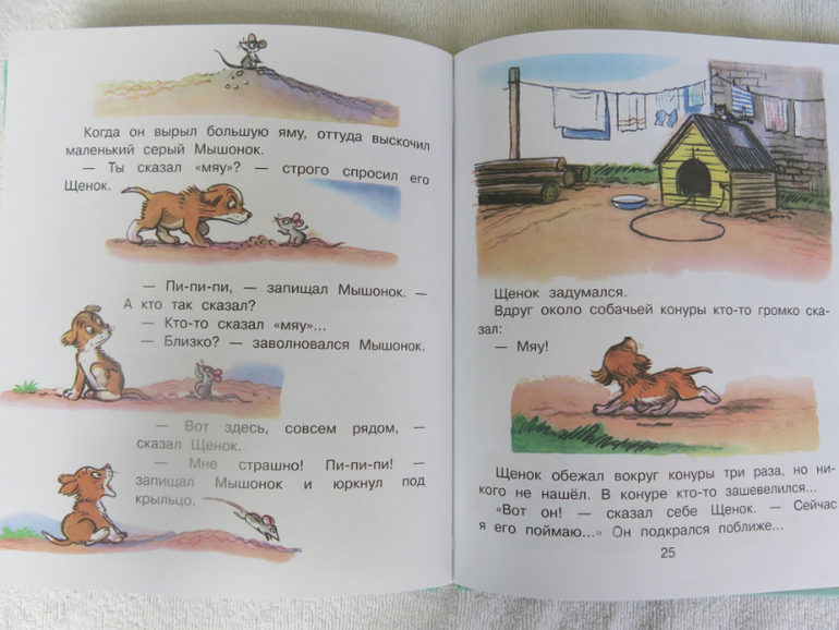 Сутеев. В.Г. "Загадочные истории" Всего три сказки на первом месте «Кто сказал мяу?», на втором «Под грибом»…а третью "Это что за птица?" мы пока не читаем, сложная) Твердая обложка (немного с блестками), квадратная книга. Рада, что сын оценил! Ведь Сутеева, мне кажется, можно докупать бесконечно - столь велико его разнообразие сюжетов. Эта самая длинная книга из всех, что мы можем выслушать, но не без маминых звукоподражаний конечно.