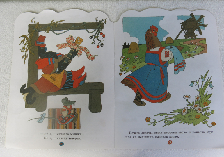"Курочка, мышка и тетерев". Русская народная сказка с необычными иллюстрациями Булатова и Васильева, о том, что лентяев не любят и высмеивают. Как в жизни, работать никто не хочет, а вот хлебушек покушать - это мы всегда готовы) Тетерев - барин красоты необыкновенной))) Краски яркие, листочки тоненькие белые. Настоящее чтение по ролям у нас получилось: «Ни я, ни я!» вертит головой сын, когда читаем) А в конце «ая-яй!» Нам очень понравилась книга!