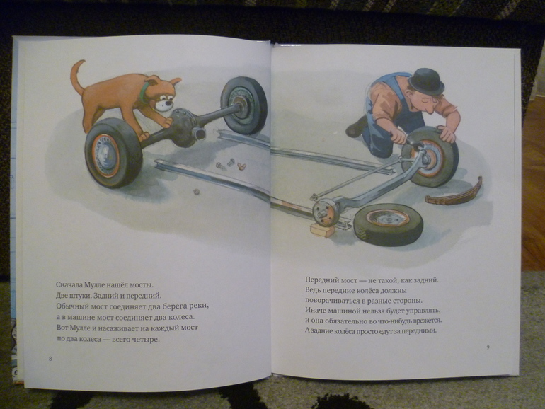 Написаны книги очень простым и доступным языком, у меня было ощущение что я не читаю Сашику книгу, а рассказываю сама историю по картинкам! В книгах "Мулле Мек делает самолет" и "Мулле Мек строит дом" есть еще один персонаж - шустрый мышонок! На каждой странице этой книги Сашик искал мышонка и перебивал меня: "Мам, смотри-ка, а мышонок то что делает!!!"