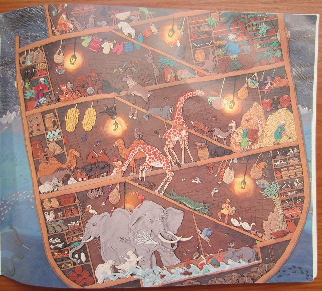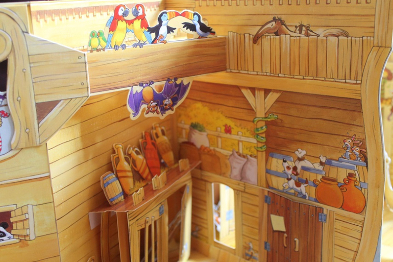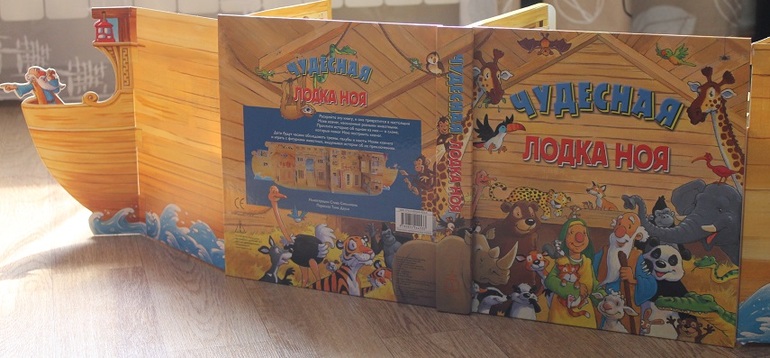 Историю о слоне из маленькой книжечки, вложенной в книжку-игрушку, мы прочитали быстро, так как были уже в предвкушении «плавания». Макет ковчега впечатляет даже взрослого: