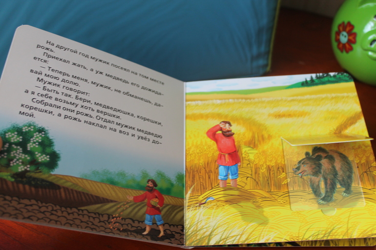 4. Мужик и медведь. Книжка с клапанами, небольшого формата, книга не плохая, купила так как брали мы недавно книгу из библиотеки Мужик и медведь, Максиму очень понравилась. Решила и нам прикупить эту сказку, не скажу что ребенок в большом восторге от книги, но сказку слушает!