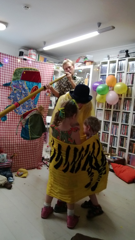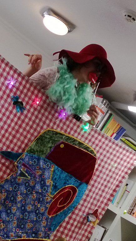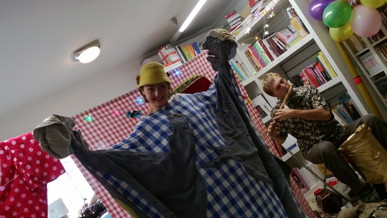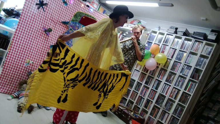 Стихи Хармса исполняются актерами и куклами, :) и сопровождаются живой музыкой этнических (и не очень) инструментов (барабана, диджериду, флейты...).