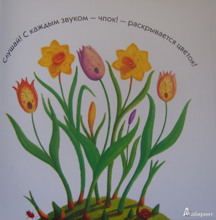 и конечно же "Слушай! Слушай!" Филлис Гершейтор - мог зависнуть на пол часа на странице, в разное время были разные любимые страницы, их мы исследовали от и до, хит до сих пор - разворот с цветами, он и ручками показывает, как они распускаются, и изображает, как бутоны поют, и показывает мне, какие цветы распустились уже, а какие еще нет, и пытается изобразить этот звук труднопроговариваемый - "чпок") Одна из самых удачных книжек у нас, а я еще сомневалась в ее покупке!