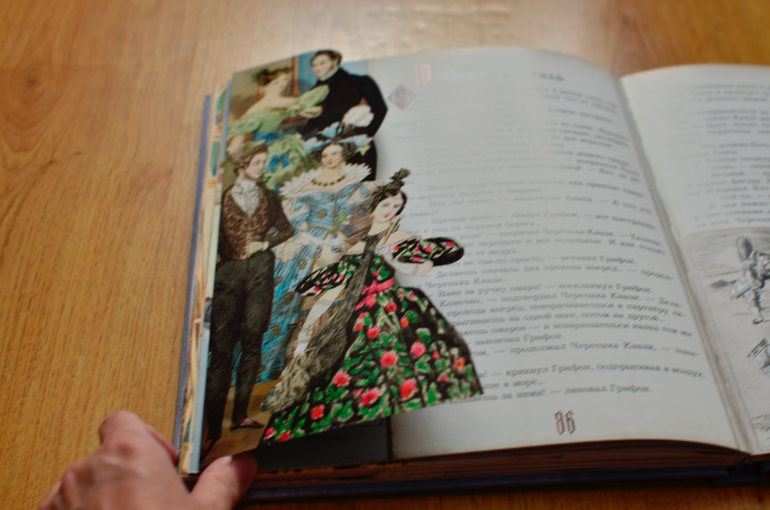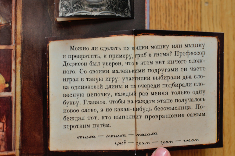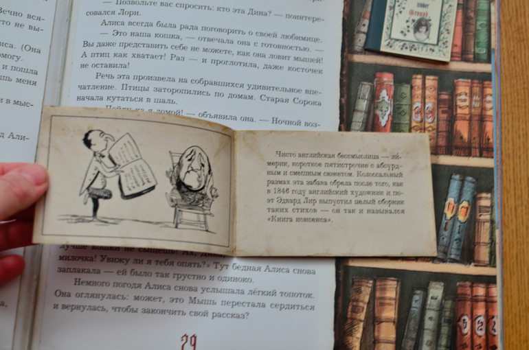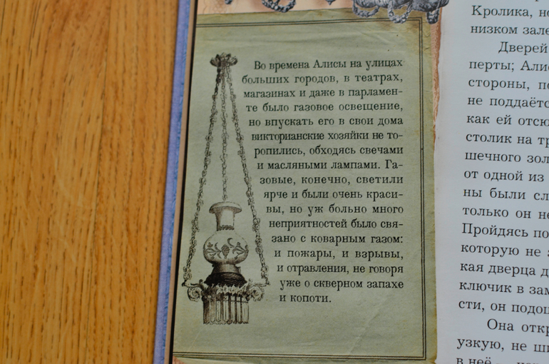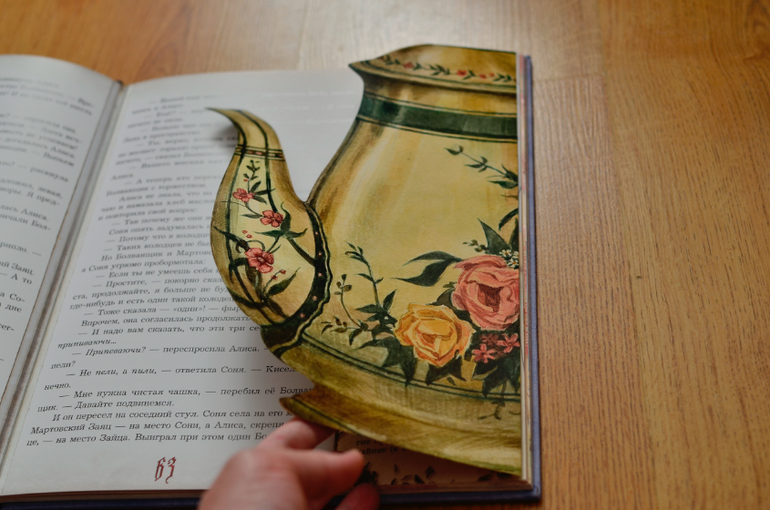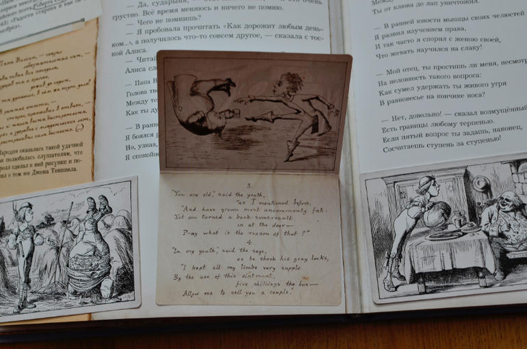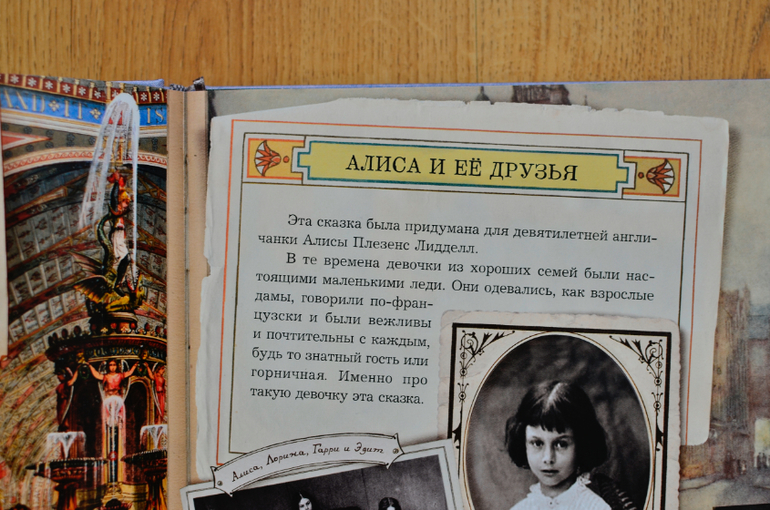 Книга полна неожиданностей и чудес, как и сама сказка Льюиса Кэрролла. На отворотах страниц и в многочисленных открывающихся окошечках сотни комментариев к основному тексту. Здесь все: от истории создания книги и биографии прототипа героини Алисы Линделл до мельчайших примет викторианской эпохи и разъяснения аллюзий, которыми полон текст сказки.