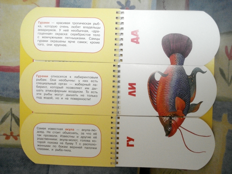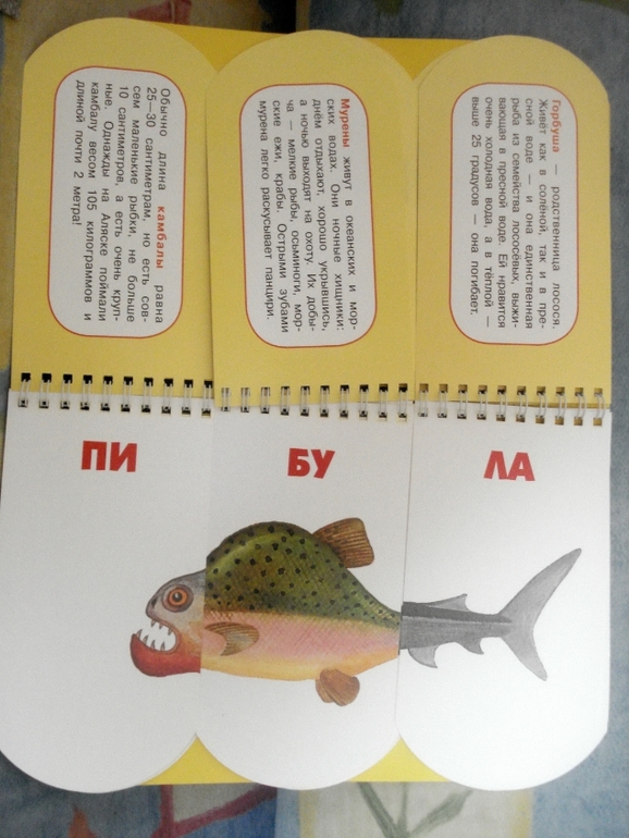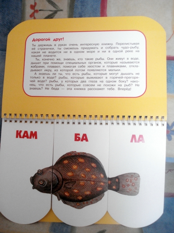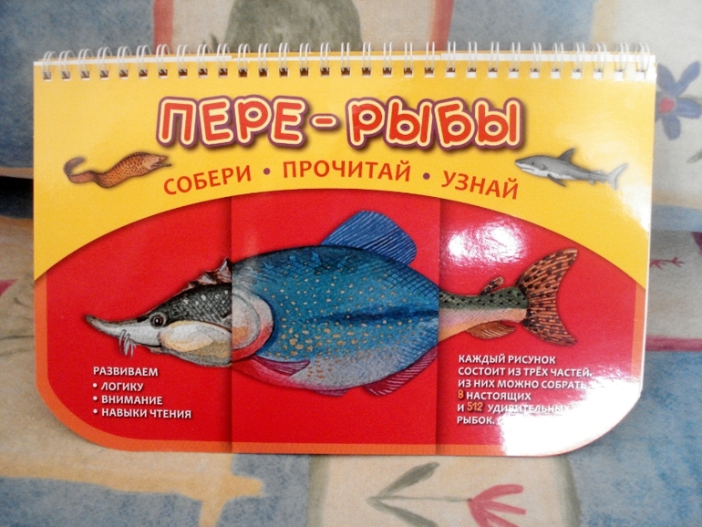 Книжка-игрушка "Пере-рыбы", аналогичная вот этой http://www.labirint.ru/books/401262/. Тоже вполне хорошая, мелованные страницы, яркая и интересная! Можно собрать множество невиданных рыбёшек, ну и конечно изучить существующих...