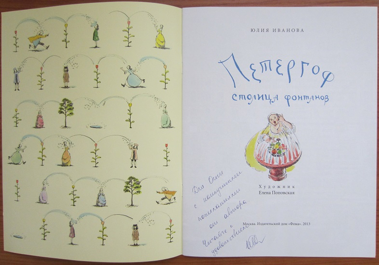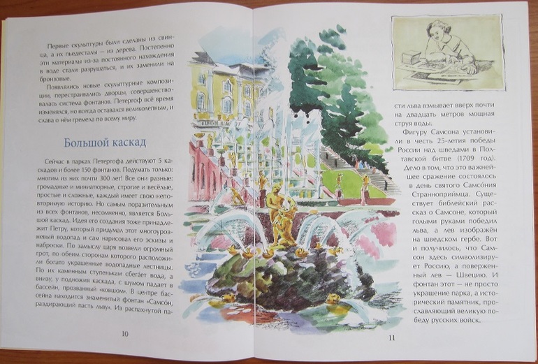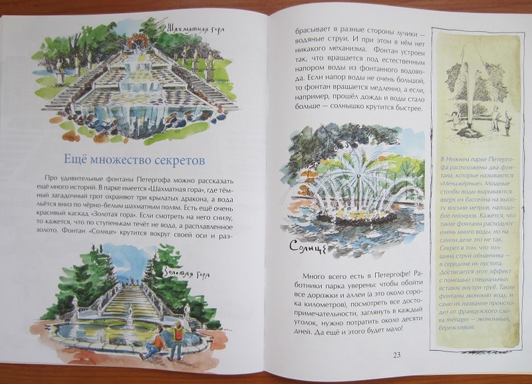В книге не рассказывается о каждом из фонтанов, это невозможно, да и не нужно для первого обзорного знакомства ребёнка с одним из красивейших уголков нашей страны.