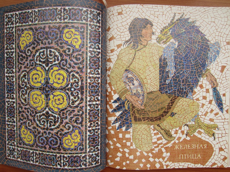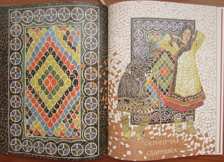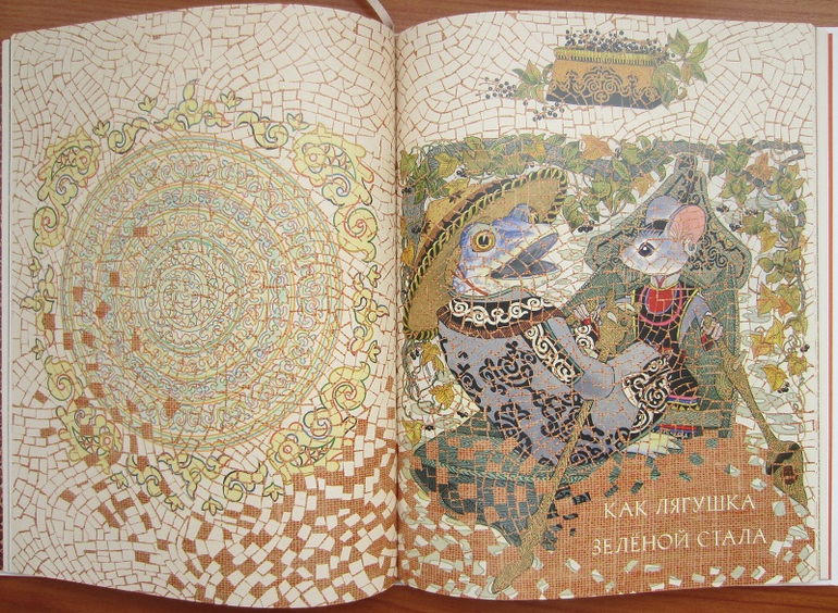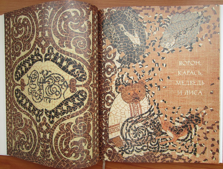 Начало каждой сказки - рассыпающийся или, наоборот, складывающийся из маленьких осколочков-«пазлов» разворот. Мы же ещё не прочитали сказку и не видим героев ярко, чётко. Очень интересная идея, мне понравилась. Вглядываешься и находишь много интересного)))