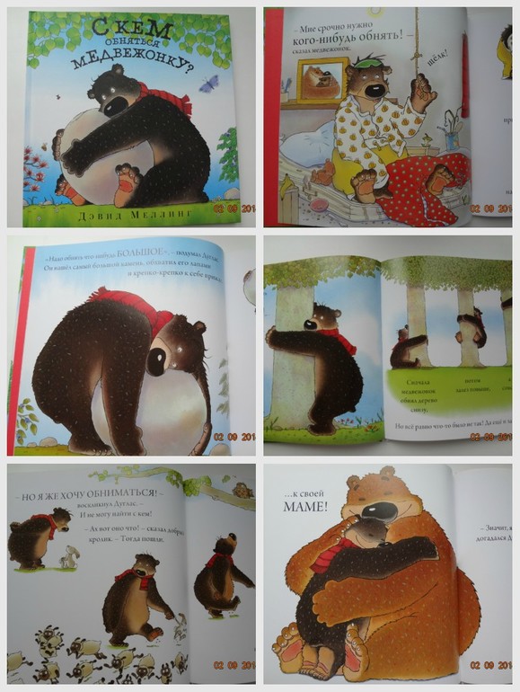 На ночь любимой книгой стала "С кем обняться медвежонку?" Дэвид Меллинг на последней странице где Дуглас обнимается с мамой, мы с Андрюшей тоже всегда обнимаемся) Книга в принципе ни о чем: медвежонок просыпается и думает, кому бы его обнять. Ходит и обнимает камень, дерево, кустик, овечек, сову, кролика, ... в конце обнимает маму. Андрюше очень нравятся иллюстрации.