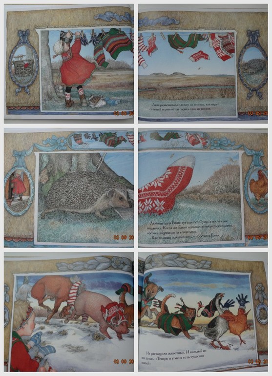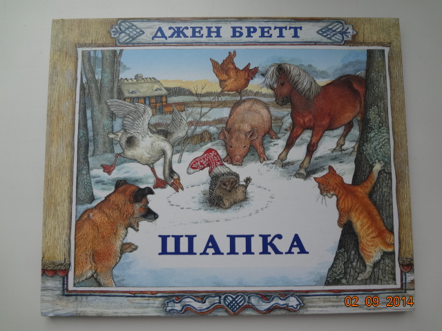 Абсолютным хитом 2 недели на даче в июле была "Шапка" Джен Бретт, мы читали ее по 5 раз в день. Иллюстрации просто волшебные. Андрюша очень наблюдательный мальчик и сразу заметил, что с веревки наверху страницы стали пропадать вещи, а животное в орнаменте на текущей странице будет уже на следующей.