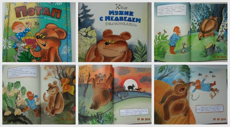 Сейчас у нас 3 хита, которые мы читаем несколько раз в день. Это - мало текста и очень много картинок, всё как мы любим. Очень любит первую и последнюю историю. Первую про репу (следствие отдыха на даче, там мы наблюдали как репка растет и даже тянули ее) и последнюю про злого охотника. Сейчас у Андрюши период страхов, он боится черной трубы, дяди в шлеме, а в этой истории - злого мужика)
