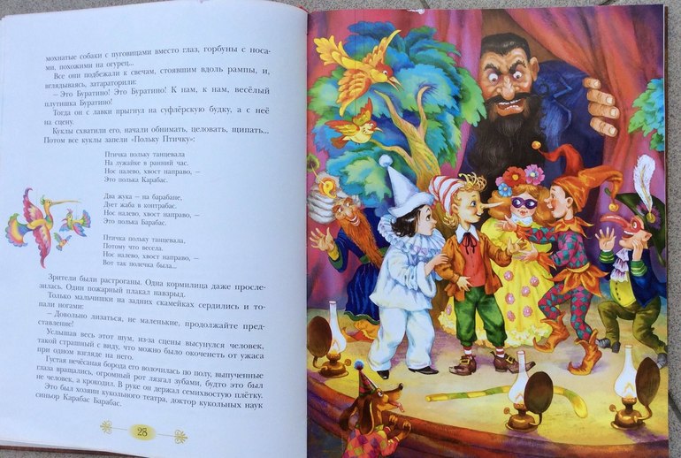 Читали полный вариант произведения А.Толстого. Это первая такая большая книга для нас. Дочка слушала с интересом; конечно, она не поняла многое, поэтому сейчас мы ее перечитываем - и я замечаю по вопросам дочки, что она слушает более вдумчиво и заинтересовано. Сегодня мы читали про первую встречу Буратино с куклами и Карабасом - доча распрашивала меня: "А Карабас злой или добрый? А почему куклы так боятся его??"