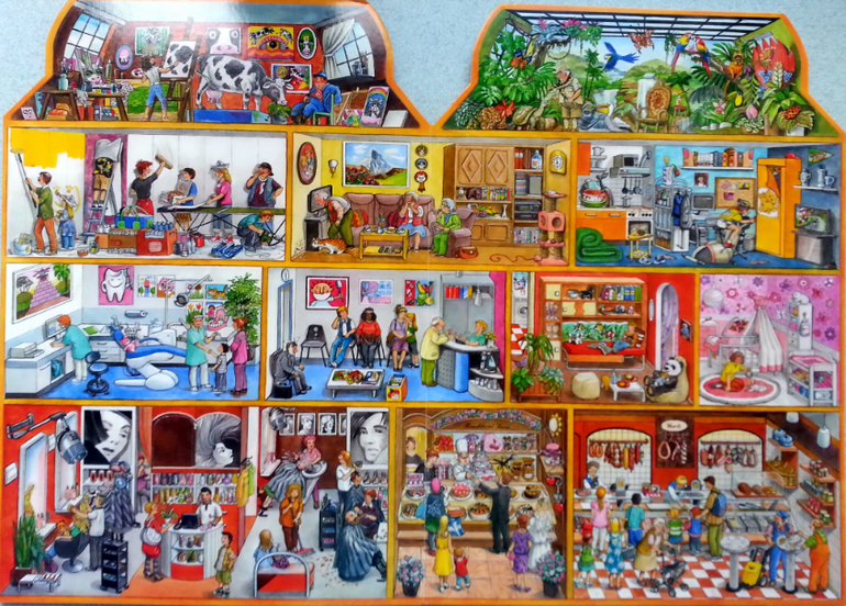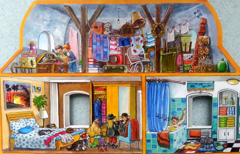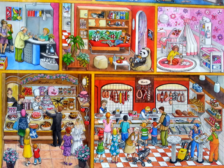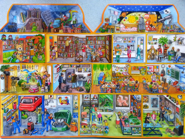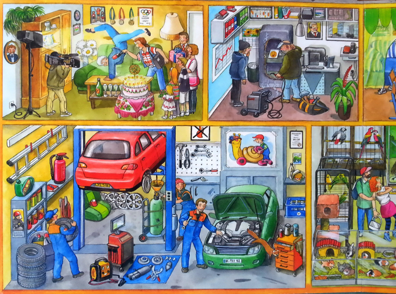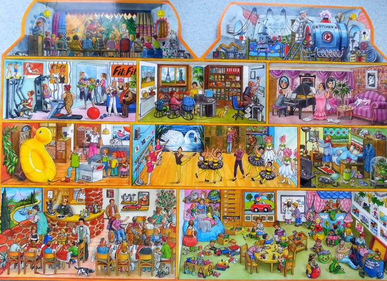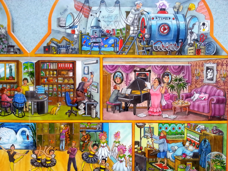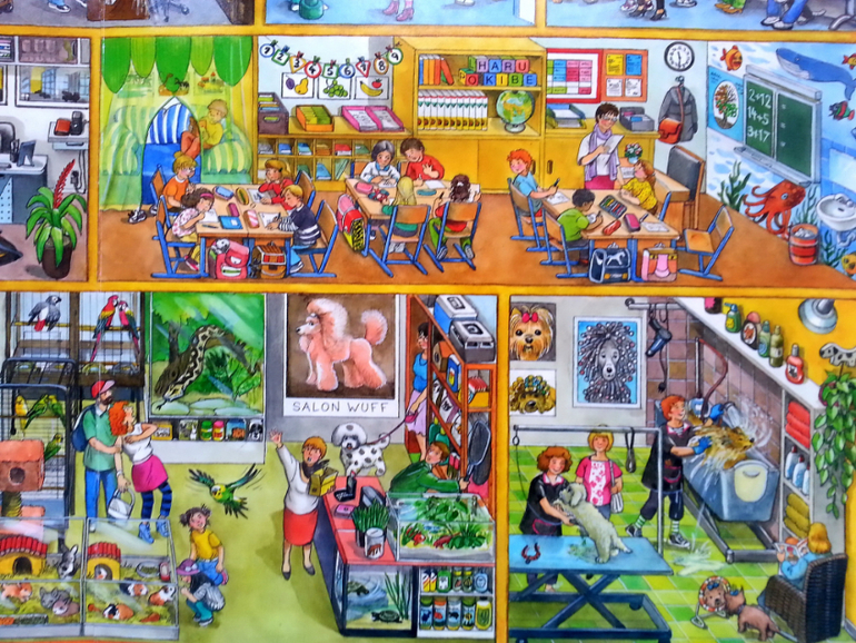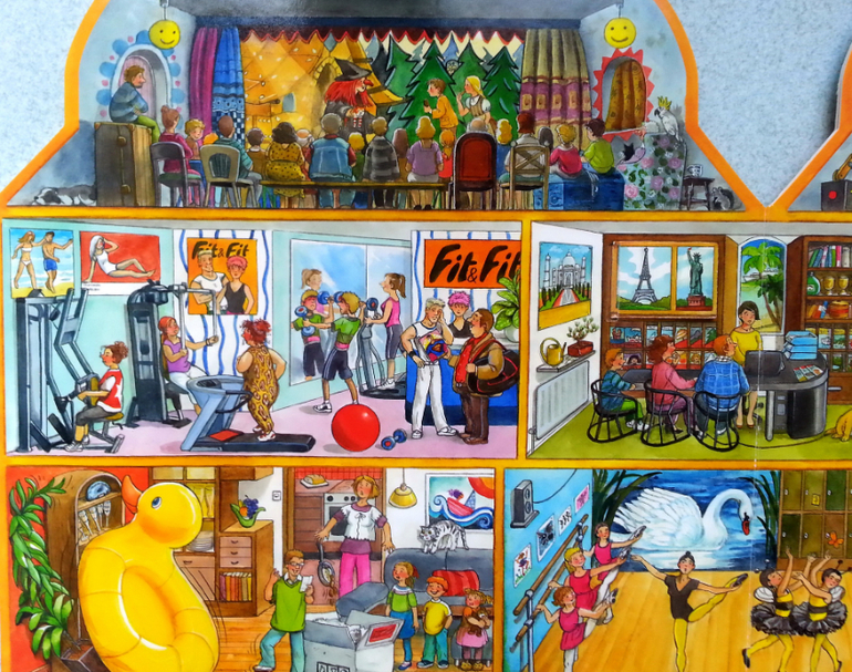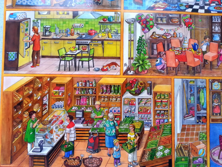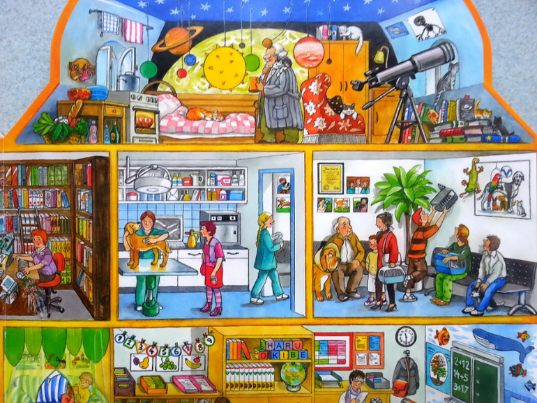 Очень понравилось, что в такой небольшой по объему книге, удалось вместить огромное количество жизненных сценок. Здесь вам и обычные квартиры, и магазины, поликлиники, ветлечебница, садик, школа, кружки, театр, ну и что особо порадовало, так это, что есть библиотека.