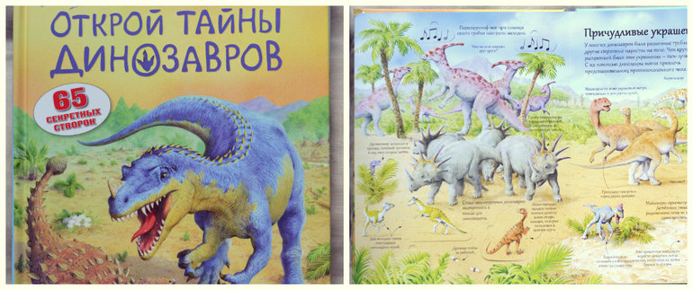 1. «Энциклопедия древностей. Динозавры» от Розового Жирафа. Думаю, об этой книге знают уже все! Объемные и яркие фигуры древних рептилий ждут вас на каждом-каждом, даже самом маленьком, развороте книжки! Тексты понятные и не сложные. Если вас не пугает ее цена, то книга придется по вкусу всем динолюбителям!