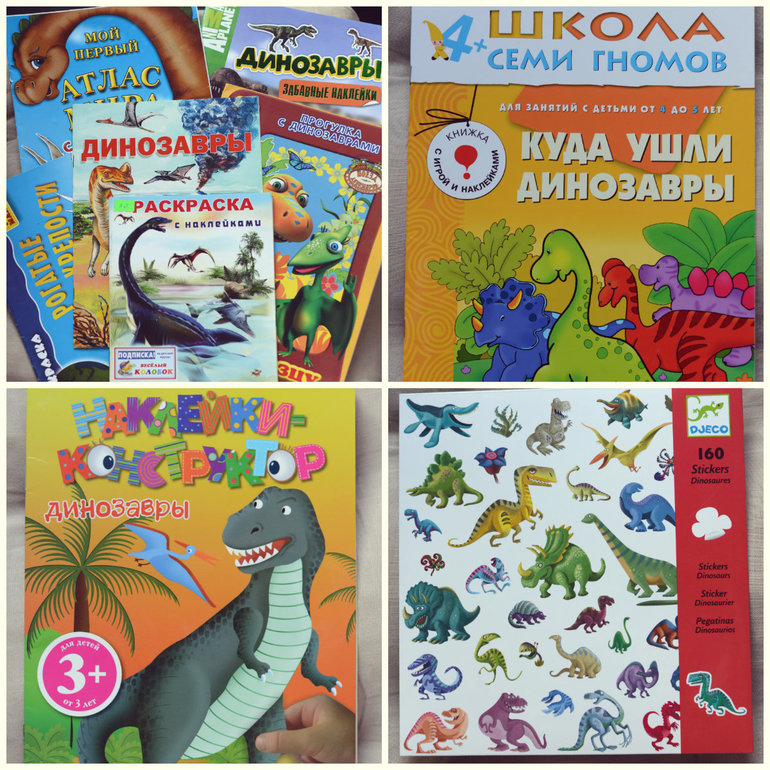 3. Еще у нас множество небольших раскрасок и книжек с наклейками на дино-тему. Не буду говорить о них подробно, ибо их вокруг миллионы и все они чем-то хороши)) Отдельно упомяну наклейки Djeco - они позитивны и точно порадуют маленьких динозавроведов!