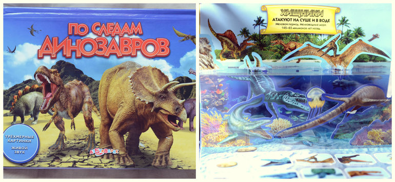 1. «По следам динозавров» от Азбукварика. Милая книжка, объемные картинки и рычаще-кричащие звкуки. Есть развороты с информацией о рептилиях. Под большой объемной картинкой картинки с названиями. Как первая книжка, наверное, нет… Но если детенышу близка дино-тема, то книжка ему точно понравится!