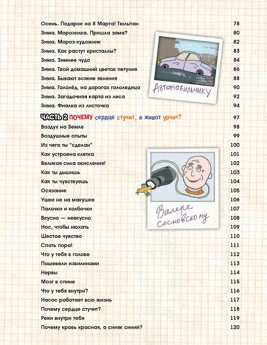 Открой эту книгу - и ты поймешь, откуда берутся облака и почему в небе светит радуга, отчего желтеют листья и зачем осенью птицы улетают на юг. Ты узнаешь, почему мы чихаем и зеваем, зачем нужны мышцы, как работают сердце и мозг. А еще сможешь увидеть звук, сделать облако в банке, заставить яйцо нырять и вырастить целый лес кристаллов.