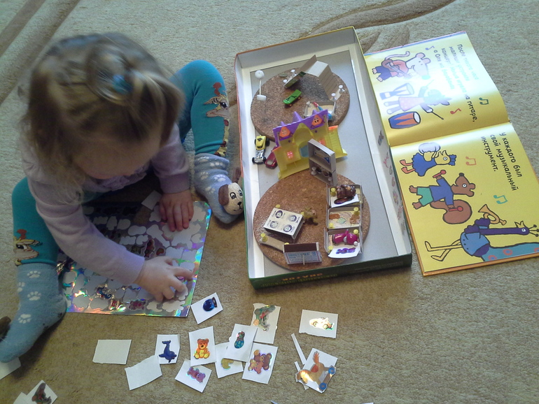 Мыша с друзьями спят, и мы наших уложим! А пока спят,подготовимся к играм с малышами. Заполним шкафчик игрушками (клеим наклейки на бумажечки формата нашего шкафчика - спичечного коробка)