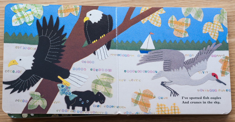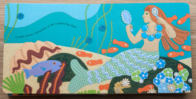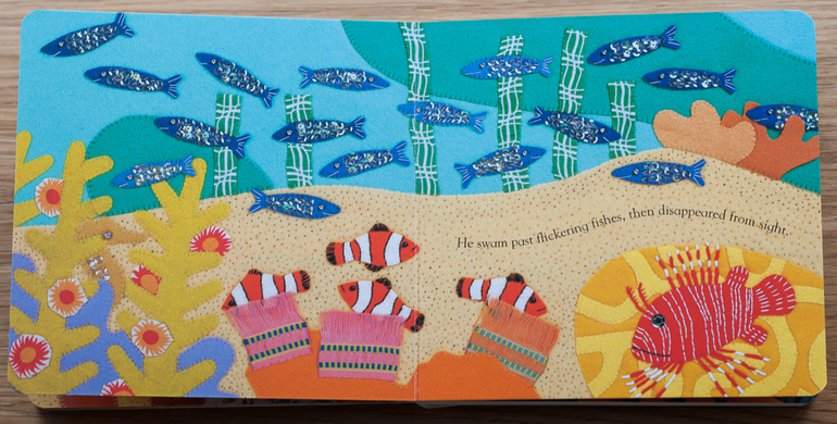 Эта книга - наш фаворит, в ней нужно искать морского конька. Очень любим ее рассматривать, искать разных животных, прятать рыбок под ладошками от акулы, расчесывать волосы как русалка, искать рыбок определенного цвета и т.д. Иногда даже возникает ощущение, что странички действительно из ткани, а не бумаги )).