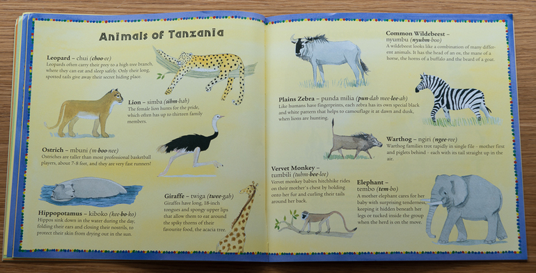 В этой книге группа детей из народа Масаи (Танзания) отправляется в сафари, в ходе которого учится считать. Не знаю как вам, а мне иллюстрации запали в душу еще при просмотре с амазона. В конце книги даны интересные сведения о Танзании, о народе Масаи, значении имен каждого из детей, счет по суахили, краткое описание каждого животного (мини-энциклопедия)). Надеюсь Вам книга тоже понравится.