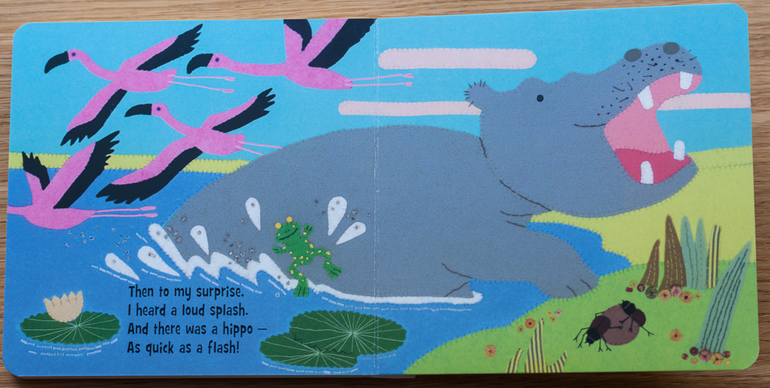 В этой книге нужно искать спрятавшегося бегемота, ну и одновременно учить названия животных Африки, учиться счету, спасать птичек от крокодилов и т.д.