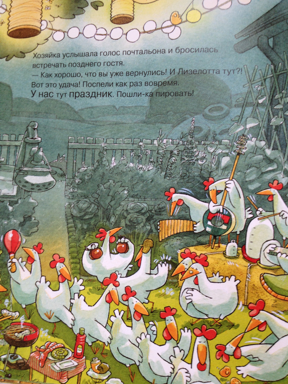 Я просто обожаю эту книгу, а сын пока не проникся. Иллюстрации замечательные! Курицы это просто нечто! Корова тоже не промах. История довольно забавная. Почтальон в деревне ушел в отпуск, корова решила что она не хуже и тоже должна уйти в отпуск. Но автобусов не было, пришлось остаться на хуторе. И вот всю книгу корова пытается доказать курам что ей хорошо отдыхается.