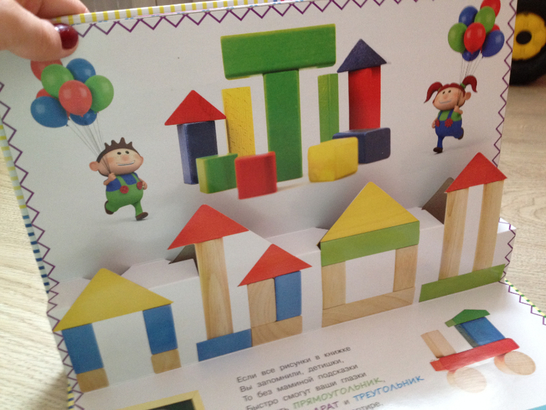 Пять разворотов, всего 4 фигуры. Двоякое мнение об этой книге. Она для маленьких, потому что после 2х лет все детки обычно знают все 4 формы и им не интересно. То есть книга до 2 лет. Но до 2 лет ребенок в книгах-панорамках все тянет и рвет, поэтому какой смысл? Купить в 1.5. и почитать полгода и очень осторожно, все время одергивая «не рви, осторожно, не тяни, не трогай…». Это моё мнение. Хорошая, но бесполезная.