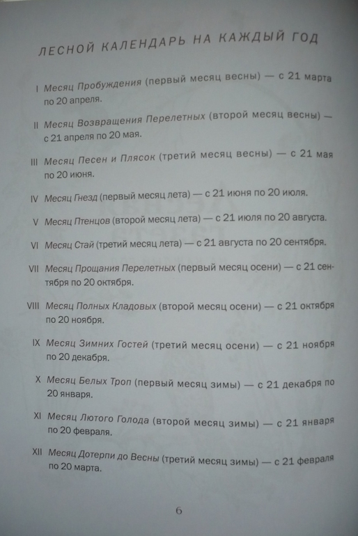 В книгу включены рассказы о шести месяцах: месяц прощания перелетных (сентябрь), месяц полных кладовых (октябрь), месяц зимних гостей (ноябрь), месяц белых троп (декабрь), месяц лютого голода (январь), месяц дотерпи до весны (февраль).