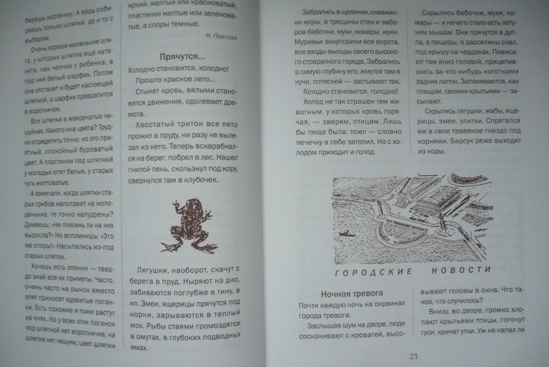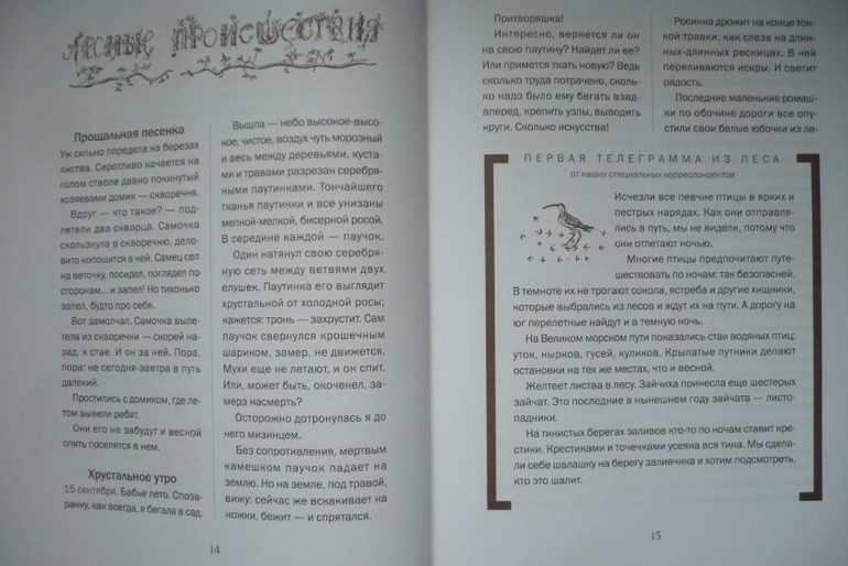Я постоянно обращаю внимание сына на те или иные изменения в природе: кратко описываю происходящее или стихи рассказываю. А недавно попробовала зачитать описание месяца сентября из методички "Календаря наблюдений" (писала о нем тут http://www.babyblog.ru/community/post/kids_books/3145043)... Сын с удовольствием прослушал! Решила, что нужны художественные тексты с различными научными фактами. "Лесная газета" идеально подошла! Сын слушает короткие рассказы во время своих полетов на качелях или во время наших объятий на скамейках.