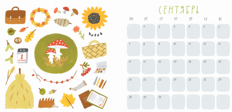 На его страницах изображены своего рода напоминания и подсказки, что можно сделать в этом месяце, на что обратить внимание, что вспомнить. В календарной сетке удобно делать записи о самых ярких моментах прошедшего дня.2-3 слова (за маленького ребенка с его слов может писать мама):
