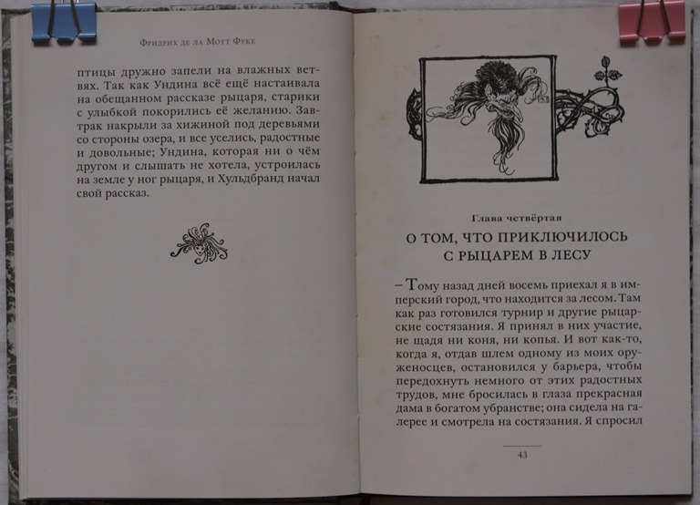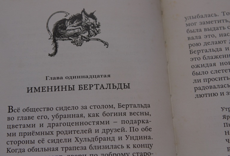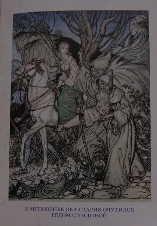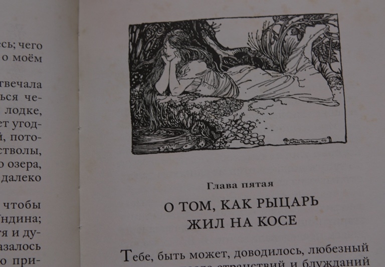 Начав читать книгу, подумала: "что я купила?" Поясню, я уже более 10 лет не смотрю ужасы и не читаю книги-ужастики, не хочу, не нравится мне бояться. Но оторваться от книги не могла, оказалось очень интересно. Потом поняла, что меня больше пугает мое разыгравшееся воображение и небольшие черно-белые рисунки А.Рэкхема с изображением страшных рож в начале каждой главы. Прочитав больше половины книги в напряжении, я поняла, что ничего страшного не было и не будет и уже читала и наслаждалась. Сюжет необычный, про любовь (это я очень люблю),про верность и благородство, про духов леса, духов земли, духов воды. Книга повествует о любви ундины(духа воды) и рыцаря, и кажется очень современной и модной, если вспомнить ошеломительный успех книги и фильма "Сумерки" про любовь девушки и вампира.
