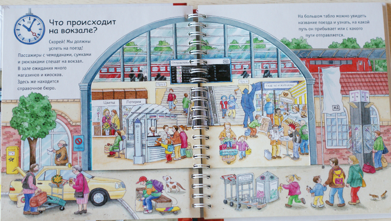 Книга о поездах и вокзале. В доступной форме рассказывается о том, что происходит на вокзале. Удобные перекидные части страниц позволяют заглянуть внутрь вокзала и узнать, что же расположено за фасадной стеной.