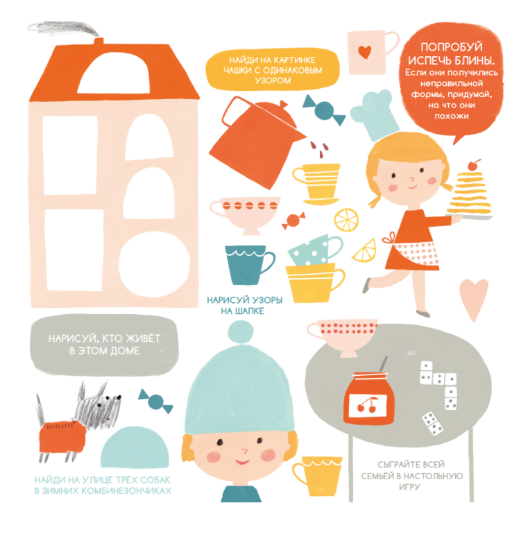 В январе можно лепить снеговиков, искать одинаковые снежинки на картинках или собак в одинаковых комбинезончиках. В апреле - посчитать, сколько птиц поют на улице или посадить какое-нибудь необычное домашнее растение. А в августе - найти падающую звезду на небе или устроить день смеха и улыбок.