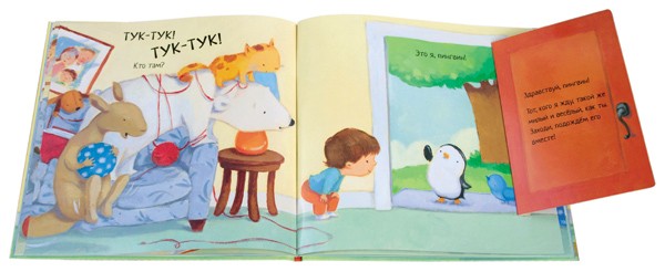 Я, как настоящая мама, меняя голоса и стуча каждый раз по книжке, не ожидала такой реакции моего ребенка: перед тем, как я открою картонную дверь, Бусинка показывала на дверь, входную, настоящую, и смотрела на меня удивленно, мол, почему я не иду открывать.