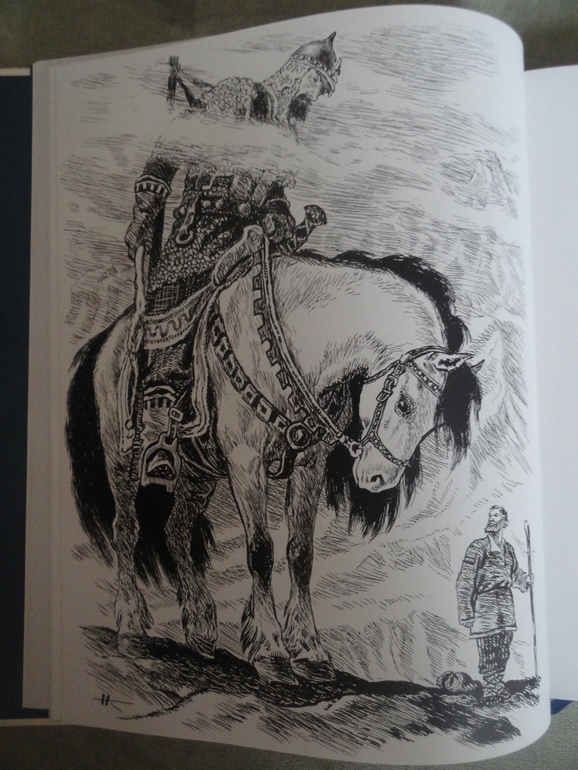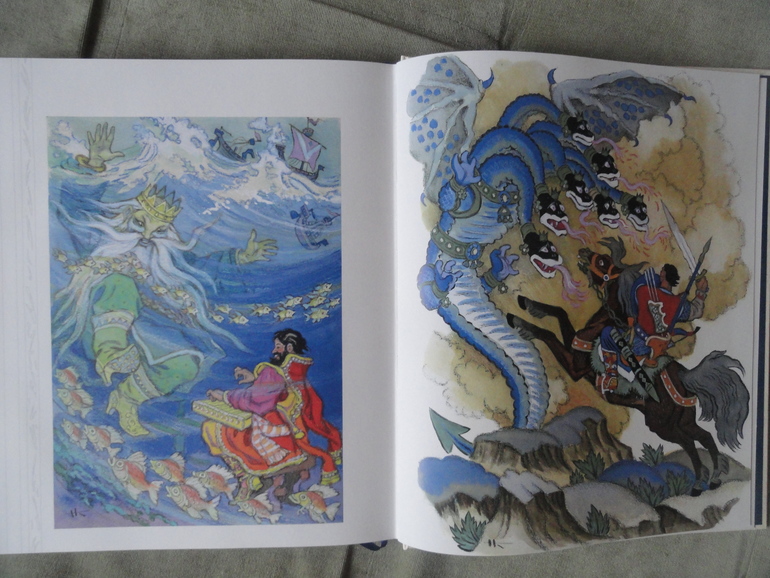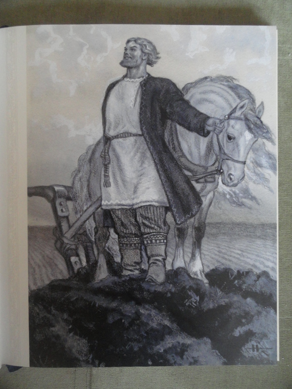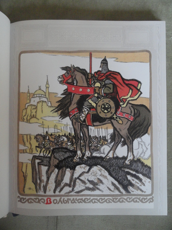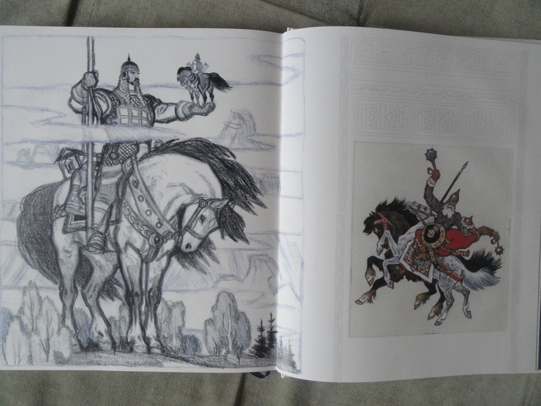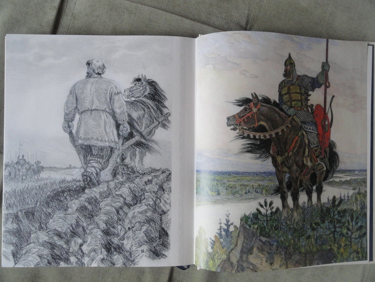 Русь богатырская читал, потому что проходили по литературе былины. От этой книги я в небольшом разочаровании. Из-за того что иллюстрации в книге выполнены в разной технике она мне показалась какой-то не цельной что-ли. В основном в книге черно-белые картины, есть на весь лист, есть маленькие рисунки.![]()