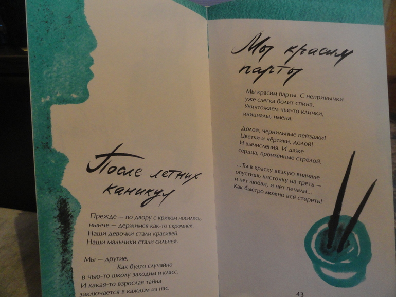 Решила я сыну ввести в его чтение стихи, так как заметила, что он очень торопится и читает их без особого выражения. Я стала переживать, что он потом своим детям не интересно будет читать детские стихи))) и решила его потренировать))).Он не отказался, читал мне когда я на кухне занималась делами. Стихи ему понравились, читал и улыбался. Хороший сборник, но маленький, вот был бы в два раза потолще....Стихи про детей-школьников, про их жизнь и переживания, про их внутренний мир. Побольше бы таких сборников стихов.