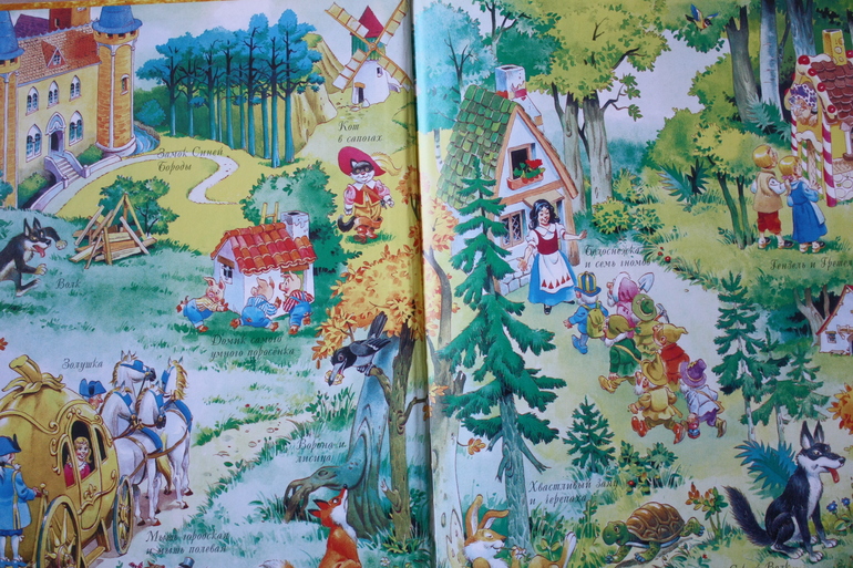 Пухлая обложка с золотом. На форзацах, оформлены каждый по-своему, собраны герои сказок, тут и Белоснежка, и Кот в сапогах, и Аладдин, и Иван-царевич, и кого только нету, совсем не из сказок, собранных в книге, но все нарисованы итальянским детским художником Тони Вульфом. Такие две гляделки из сказочного мира.