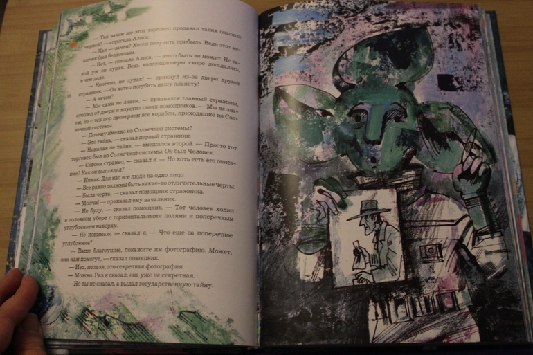 Привлекла книга в первую очередь голограммой. Девочки любят блестящее. Ну и как бы сразу намекает - фантастика, космос. Внутри книга тоже не разочаровывает, приятные, опять же космические, иллюстрации, приятные на ощупь страницы, крупный шрифт.