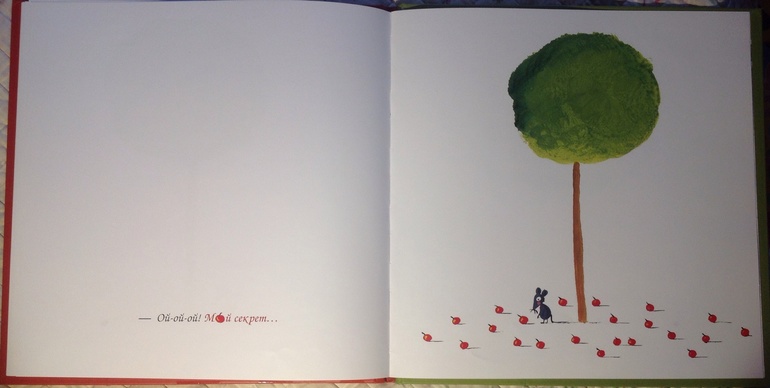 13. "Секрет" Эрика Баттю - оригинальная сказка в картинках в духе Владимира Сутеева) Мышонок нашел яблоко, зарыл в землю, чтобы спрятать, из яблока выросло дерево. Иллюстрации предельно наглядные, ничего лишнего.