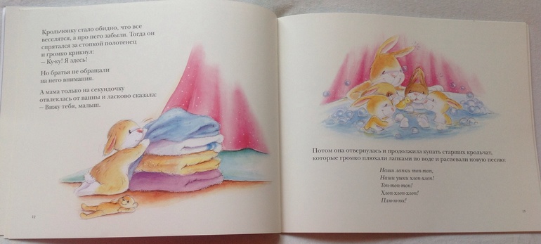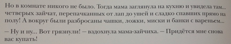 "Кролик идет купаться" - любимая книга дочки. Крольчонок не хочет купаться, мама купает его братьев, крольчонок начинает ревновать, мама купает его отдельно, за это время братья успевает испачкаться и их снова нужно мыть. Вроде бы не очень поучительно, но образ терпеливой и любящей матери-героини-крольчихи мне нравится. А еще в книге много нежностей и всяческих обнимашек, у дочки она уже разошлась на цитаты)