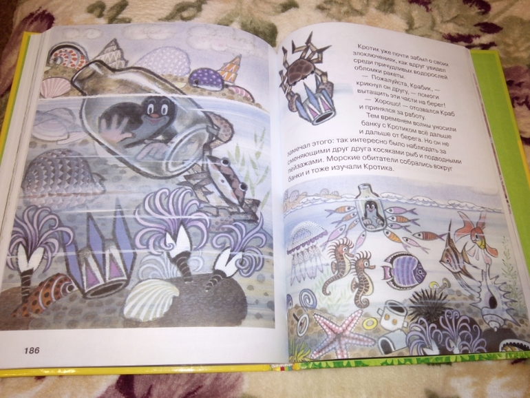 Ну кто, в моем возрасте не помнит этот мультфильм чешского производства. В книге все как в мультике, правда они (мультики) намного короче)), здесь аж 208 стр. Сонька бесконечно просит ее читать, а т.к. у нее уже даааавно есть такой Кротик в виде мягкой игрушки, она пытается моделировать ситуации.