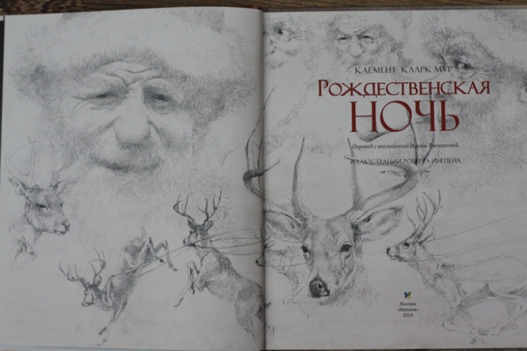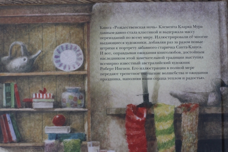 В книге известное стихотворение Клемента Кларка Мунка в переводе Ирины Токмаковой. Красивое, с настоящим рождественским настроением, с чудесными описаниями. Читается легко и непринужденно. Иллюстрации - просто слов нет, очень трепетно воспринимаю работы Роберта Ингпена - такие они живые, настоящие. И хотя уже узнаю его манеру, каждый раз, открывая новые книги с его иллюстрациями смотрю во все глаза, выхватывая интересные детали, или просто наслаждаюсь картинкой в целом... Ну сейчас не обо мне :))))