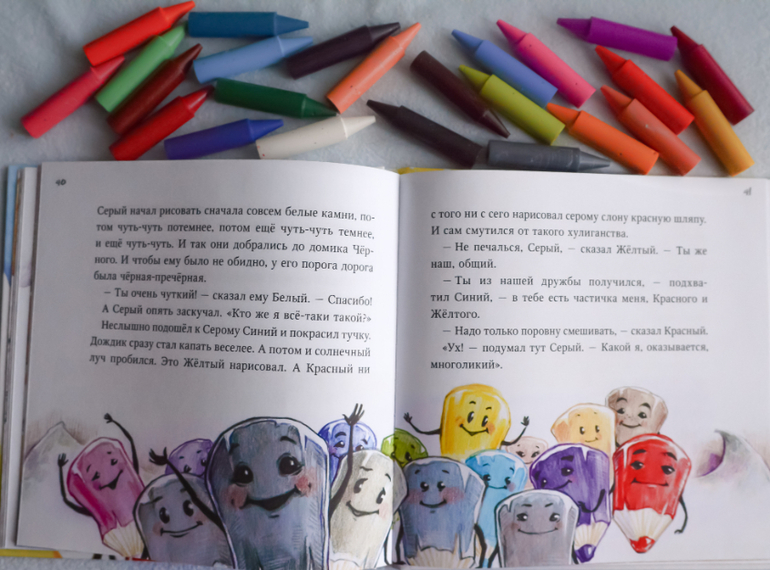 Жили-были Карандаши.... Они такие милые))) Т.к. в последнее время сын в постоянном творческом процессе, рисуем много и красками и карандашами, поэтому с книгой я угадала... Половина книги внимательно прослушал, назвал карандаши всех по цветам)))