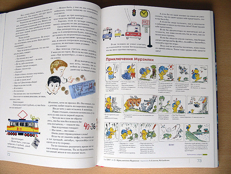 Издание собрано, словно из драгоценных камушков, на любой вкус. Оно вместило: рассказы о животных, стихи, рассказы о ребятах, познавательные статьи, игры, комиксы. Иллюстрации по качеству разные. У некоторых хочется четкости лучше.
