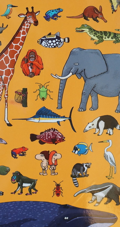 Всего в книге 5 тем: птицы, рыбы и морские млекопитающие, млекопитающие, рептилии и земноводные, насекомые и паукообразные. На некоторых страничках появляются забавные человечки.
