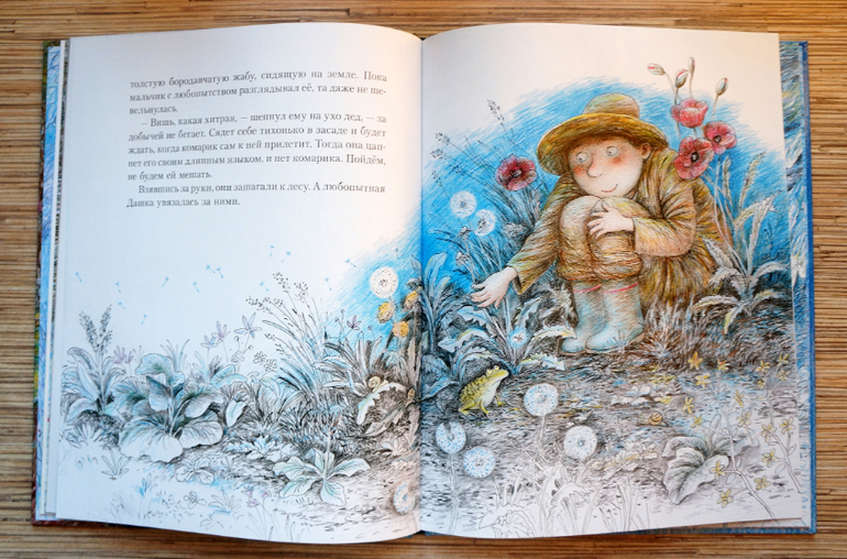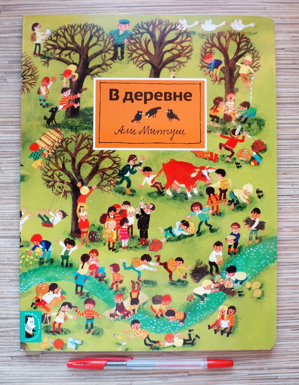 Кстати, увидев в конце зимний разворот, подумала, что в книге должна прослеживаться сезонность. Но явно это не увидела. Можно, конечно, с натяжкой привязать ко временам года, но очевидный деталей я не увидела. Разве что, на первом развороте одежда с длинным рукавом, дальше есть кое-кто в маечках, а потом дети собирают яблоки.