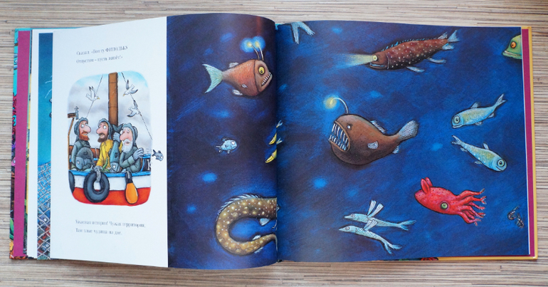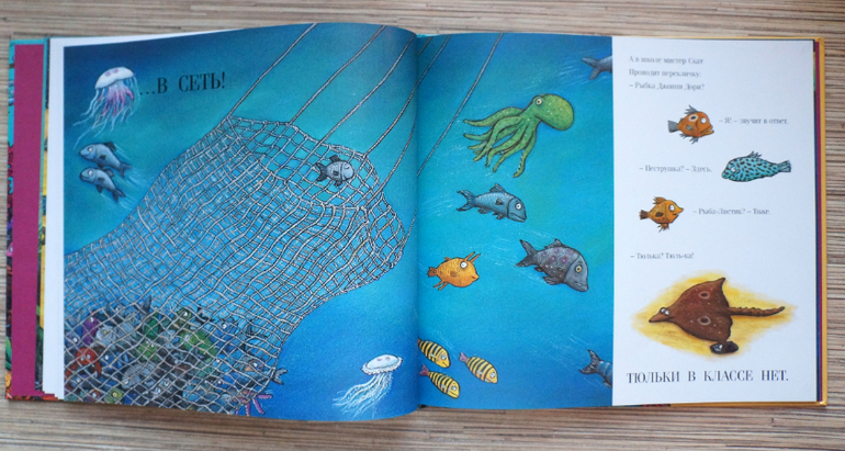 Я как-то не сразу прониклась текстом. Но чем больше читаю - тем больше нравится. Очень красивый, музыкальный перевод Марины Бородицкой. История про маленькую рыбку, которая любила приврать (ну, то есть, сочинять истории)) Забавный игровой момент - повторяющееся "Тюлька! Тюль-ка! Тюльки в классе нет." В общем, читаем часто и с удовольствием. А недавно были у врача, рассматривали аквариум и тоже искали в нем Тюльку, забавно ))) Несколько разворотов: