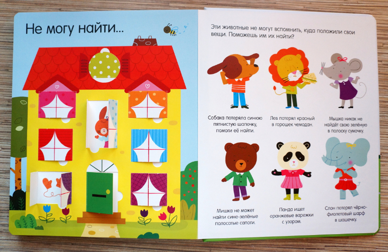 Несколько разворотов, каждый посвящен среде обитания животных. На каждом развороте - открывающиеся створки с изображением животных, которых нужно найти внутри: