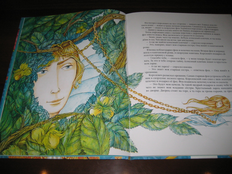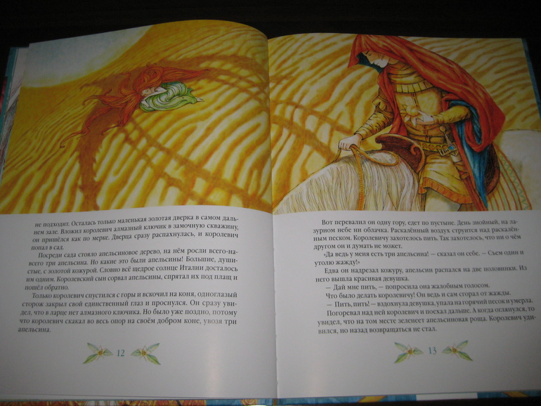 Вообще это сборник итальянских народных сказок, хотя слово "сборник" звучит немного преувеличенно, учитывая, что сказок всего три: "Три апельсина", "Полезай ко мне в мешок!" и "Три замка". По мотивам первой из них написана знаменитая пьеса Карла Гоцци. Как я понимаю, пересказывал ее и Леонид Филатов Любовь к трем апельсинам Здесь эта сказка в пересказе И. Гессе и З. Задунайской, две других - в переводе Е. Широниной. Наличие разных обработок, по счастью, никак не сказалось на качестве текста: все три сказки читаются одинаково легко, органичное единство, цельность книги не нарушена. Ну и, конечно же, мощным объединяющим началом послужили прекрасные иллюстрации.