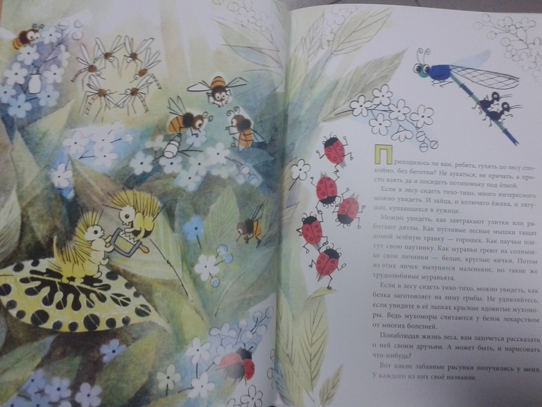 Иллюстрации мне очень понравились, милые, добрые, интересные и спокойные! С этой книгой хочется сесть под тень ветвистого дерева в теплый летний день или на свежую травку, блестящую от утренней росы и наблюдать за жизнью вокруг, размеренной, спокойной, плавной... За трудолюбивым семейством муравьев, кузнечиками-скрипачами, неторопливыми улитками и шустрыми лягушками:) Прислушаться к мелодичным или стрекочащим звукам и наслаждаться гармонией с природой:)