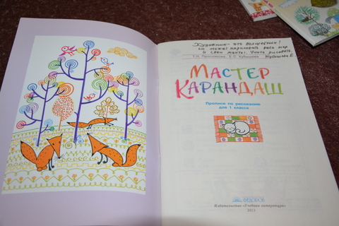 Во-первых, немного об оформлении. Мягкая обложка, плотный офсет, не очень яркая печать, но в каждой от 64 (мастер-карандаш) до 104 (радужный мир, обе книги) страниц. Можно выполнять задания прямо в прописях, но я - плюшкин. я сделала копии страниц, на которых и рисуем. Что важно лично для меня - размер заданий адекватен детским возможностям - авторы не мельчили, не частили, т.е. удобно прямо вот брать как есть и выполнять задания в прописи, а не "подобные на листочке".